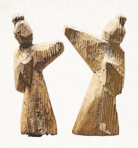舞俑有獨(dú)舞俑和對(duì)舞俑兩種組合,舞者主要通過手臂的屈伸表現(xiàn)出舞蹈姿勢(shì)。通常先雕出舞俑姿態(tài),然后以白色為底色,用墨線和紅線繪頭發(fā)、衣袖,下垂處呈圓角方形。面部五官基本被省略,主要突出的是動(dòng)態(tài)的翩翩舞姿。高度通常在20厘米左右。