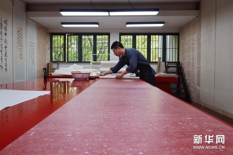 5月13日,古籍修復(fù)師在對(duì)書(shū)畫(huà)作品進(jìn)行裝裱操作。