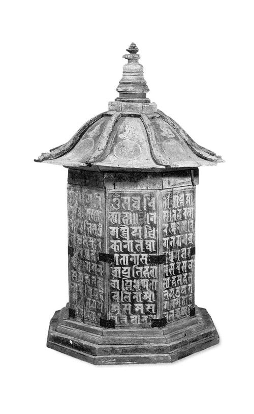 西夏木緣塔為西夏墓葬中第一次發(fā)現(xiàn)的西夏葬器。該塔通高75厘米,塔頂邊沿寬47厘米,呈四層八角形,飾紅色;分塔座、塔身、塔頂和塔剎四部分。塔座為四級(jí)八邊臺(tái)階。塔身為八邊柱體形,由長(zhǎng)34厘米、寬12.5厘米、厚2厘米的八塊木板合成,表面涂藍(lán)色,每邊有黃色工整梵文“陀羅尼”,并用漢文注明陀羅尼經(jīng)名。塔頂為傘式八邊形,每邊彩繪云氣紋和一個(gè)梵文字,內(nèi)有墨書“故考任西經(jīng)略司都案劉德仁,壽六旬有八,于天慶五年歲次戊午四月十六日亡歿,至天慶七年歲次庚辰(申)口夏十五日建緣塔,至中秋十三日入課訖”。塔剎圍欄為八邊形,其他相輪、覆缽、剎頂都是圓形,由下向上收分;底座周圍繪有卷草紋。