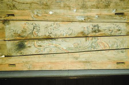 1998年新城魏晉南墓出土。這副完整的木棺由棺身和棺蓋組成,棺蓋內(nèi)側(cè)有一長(zhǎng)方形凹面,內(nèi)彩繪伏羲女?huà)z圖。伏羲女?huà)z人首蛇身,兩尾相交,伏羲在右,左手執(zhí)矩,女?huà)z在左,右手執(zhí)規(guī)。伏羲女?huà)z周?chē)椩茪饧y。棺身呈長(zhǎng)方體,兩檔頭用墨線勾畫(huà)星象圖,棺內(nèi)側(cè)四壁彩繪幃帳、絹帛、蠶繭等圖形。