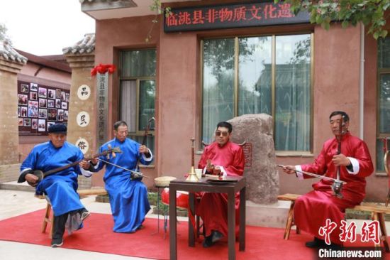 10月12日,甘肅省定西市臨洮縣舉行非物質文化遺產展示中心啟動儀式。圖為當?shù)仄び皯騻鞒腥粟w學兵(右二)帶領班社表演影子腔。 張婧 攝