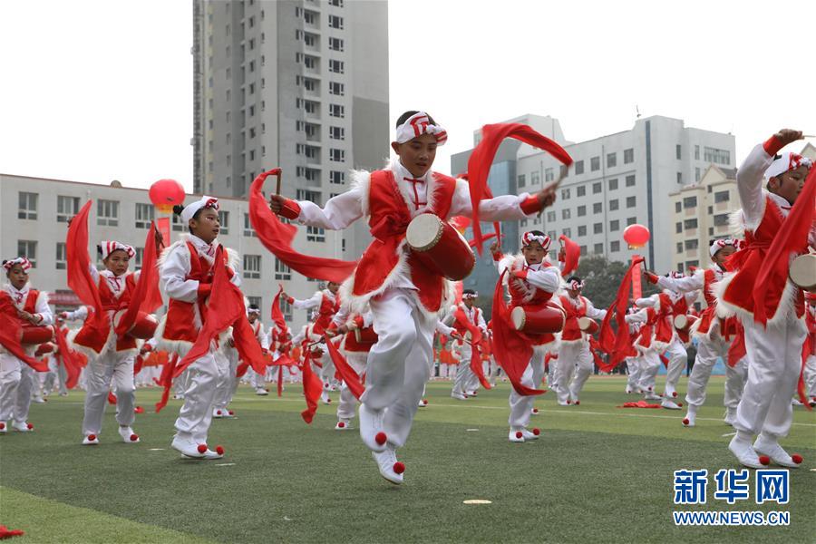 11月4日,蘭州市桃樹(shù)坪小學(xué)學(xué)生在活動(dòng)現(xiàn)場(chǎng)表演歡慶腰鼓。當(dāng)日,甘肅省蘭州市城關(guān)區(qū)學(xué)校體育“一校一品”現(xiàn)場(chǎng)展示活動(dòng)在蘭州市第五十四中學(xué)舉行,16所學(xué)校進(jìn)行了特色校園體育項(xiàng)目表演。據(jù)介紹,蘭州市城關(guān)區(qū)現(xiàn)已推廣各類體育項(xiàng)目40余項(xiàng),命名“體育特色項(xiàng)目示范校”42所。 新華社記者 張智敏 攝