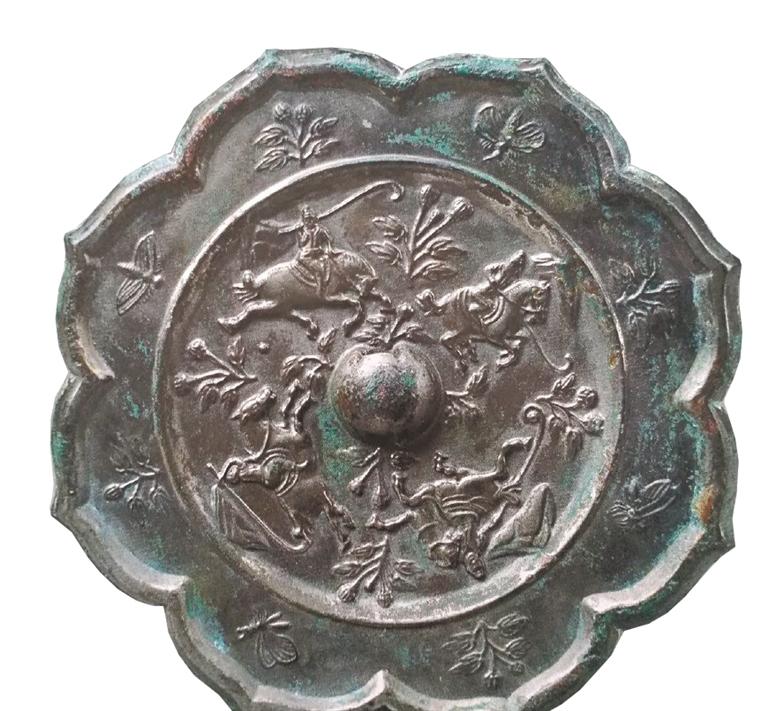 隋唐時(shí)期是中國(guó)封建政治經(jīng)濟(jì)文化高度發(fā)展繁榮的時(shí)期,唐代社會(huì)經(jīng)濟(jì)全面發(fā)展,手工業(yè)各部門(mén)也都興旺發(fā)達(dá),青銅鑄造業(yè)中的銅鏡業(yè)尤為突出,無(wú)論造型、題材、紋飾、鑄造工藝,都突破了前代的模式,達(dá)到了中國(guó)古代銅鏡藝術(shù)的巔峰。唐鏡鏡型厚實(shí),方形鏡、菱花形鏡、葵花形鏡流行;紋飾題材多見(jiàn)瑞獸、飛鳥(niǎo)以及葡萄、花草等;瑞獸葡萄鏡最具特色,是中西文化融合的杰作。