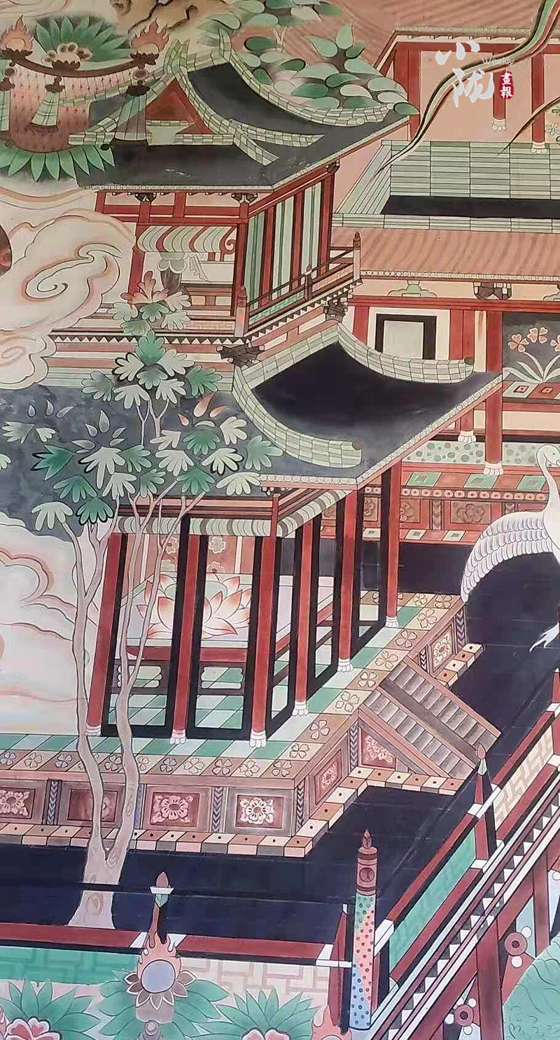 畫(huà)面的后方是亭臺(tái)樓閣,回廊里,左邊是白鶴展開(kāi)雙翅,嘴里好像發(fā)出美妙的聲音,迦陵頻伽人身鳥(niǎo)尾,雙手弄拍展翅而舞,尾如卷云漩渦?;乩扔疫?,共命鳥(niǎo)一身二頭,展翅而舞,孔雀輕歌曼舞,展翅回首,還有翩翩起舞的鸚鵡,他們是能為人言而美麗的祥鳥(niǎo),他們的聲音能增進(jìn)人們善德的力量,促進(jìn)人們?cè)缛者M(jìn)入想象的幸福世界。