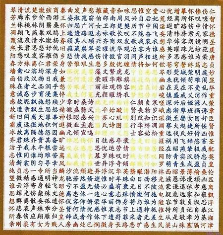 蘇蕙《璇璣圖》不僅是一束厚重的文學奇葩,也是一幅充滿創(chuàng)意的藝術巨制。她將詩歌的載體從傳統(tǒng)簡帛紙張轉換成為錦。錦是有彩色花紋的高級絲織品。以錦為書寫材料制作《璇璣圖》,除詩歌本身的創(chuàng)作外,首先需要染絲紡織。錦織好后,又要對《璇璣圖》謀篇布局,劃區(qū)設色,書詩于錦,然后一針一針地將它繡出來,變?yōu)榛匚腻\字。那每一道工序,要求都極精細,不得有半點疏忽,不然就會留下污點和遺憾。蘇蕙集眾藝于一身,完美地將其制作出來,體現(xiàn)了她的綜合藝術才能。取名“璇璣(泛指北斗)圖”,寓意它像北斗,可以旋轉地讀。它是在華美的錦上,又以五彩繽紛的絲線繡上《璇璣圖》,不僅顏色更加艷麗,而且那841個金玉珠璣般文字,展現(xiàn)的令人眼花繚亂的詩歌園地,更是前不見古人,后不見來者,比錦繡的光彩更加耀眼奪目。