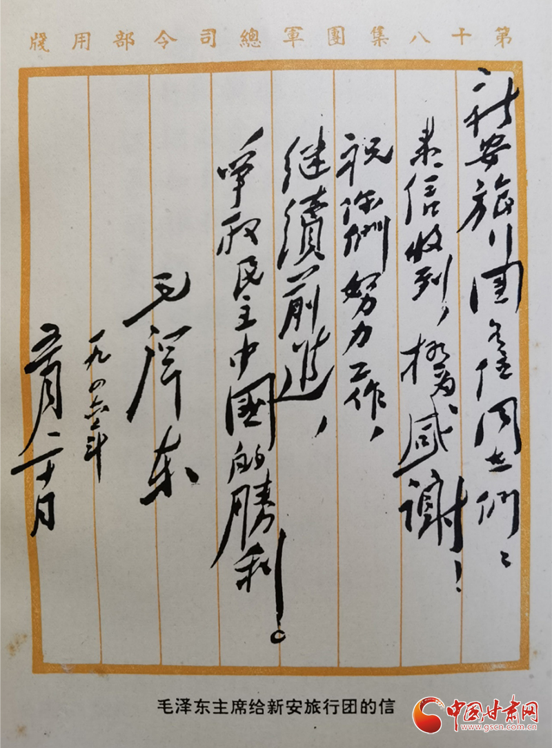 1946年5月20日,毛澤東主席給新旅回信:“新安旅行團各位同志們:來信收到,極為感謝!祝你們努力工作,繼續(xù)前進,爭取民主中國的勝利。”時隔75年后的2021年5月30日,習(xí)近平總書記給新安小學(xué)的少先隊員們回信:“當(dāng)年,在黨的關(guān)懷和領(lǐng)導(dǎo)下,‘新安旅行團’不怕艱苦,足跡遍及大半個中國,以文藝為武器,喚起民眾抗日救亡,宣傳黨的主張,展現(xiàn)了愛國奮進的精神風(fēng)貌。希望你們結(jié)合自身成長實際學(xué)好黨史,以英雄模范人物為榜樣,從小堅定聽黨話、跟黨走的決心,刻苦學(xué)習(xí),樹立理想,砥礪品格,增長本領(lǐng),努力實現(xiàn)德智體美勞全面發(fā)展。”