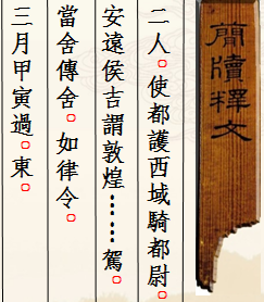 木簡(jiǎn)1枚(出土編號(hào):Ⅱ90DXT0213③:135),1990年出土于敦煌懸泉置遺址。長(zhǎng)7.2、寬1.3、厚0.25厘米。木簡(jiǎn)上殘,兩行書(shū)寫(xiě),字跡模糊,難以辨識(shí)。簡(jiǎn)文作“二人。使都護(hù)西域騎都尉、安遠(yuǎn)侯吉謂敦煌……駕,當(dāng)舍傳舍,如律令。三月甲寅過(guò),東。”。簡(jiǎn)中“使都護(hù)西域騎都尉”是西域都護(hù)的正式官名,“騎都尉”當(dāng)指以本官都護(hù)西域,是其本職,而“使”則突出了使職性質(zhì)。這是懸泉置記錄的一份傳文書(shū),簡(jiǎn)文不完整,大意是說(shuō)某年三月甲寅日,西域都護(hù)鄭吉派遣的使者自西向東行,懸泉置依傳律規(guī)定,為停駐的兩名使者提供了飲食。該簡(jiǎn)文對(duì)研究懸泉置的傳舍制度,以及西漢王朝對(duì)西域行使管轄提供了重要的原始資料?,F(xiàn)藏甘肅簡(jiǎn)牘博物館。