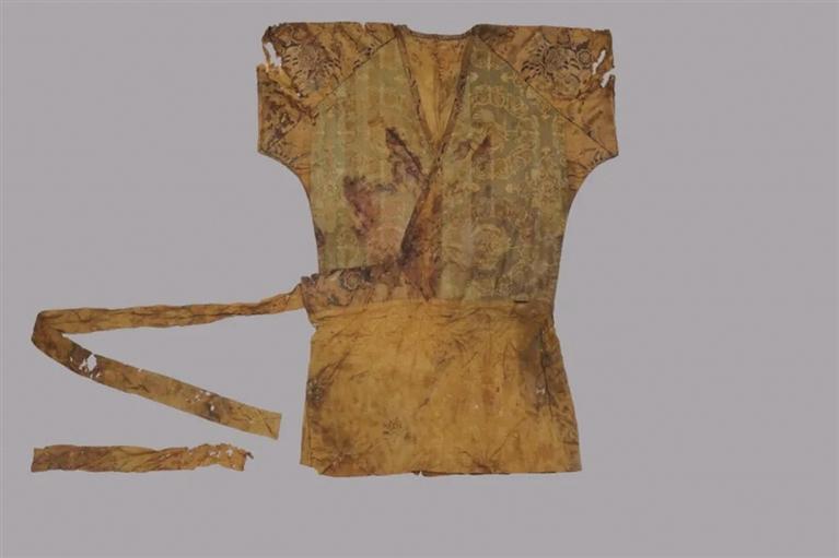 而在墓葬清理過程中,項目組經清理確認慕容氏墓棺木保存完整,棺內見人骨一具,仰身直肢。墓主身著唐朝官服,頭枕雞鳴枕,挽髻,戴巾子并簪金釵,頭套金質下頜托,面罩絲織覆面,腰束嵌金蹀躞帶,身前放置象牙笏板,蓋絲質衾褥,身旁放置有盤、碗、碟、筷、勺、胡瓶等餐飲器具;筆、墨、紙、硯等文房用具;漆奩、鏡衣、粉盒、骨笄、木梳等梳妝用具;嵌金匕首、豹皮弓韜、貼金花漆木胡祿等武器裝備。墓主身著絲織衣物多達十四層,其內包括絹、綺、綾、錦、羅、紗、緙絲等傳統(tǒng)絲織品種類兼?zhèn)?;團窠紋、對獅紋、翼馬紋、對鹿紋、鳳紋、麒麟紋等唐代絲織品紋樣兼?zhèn)?;夾纈、扎染、刺繡等唐代絲織品制作工藝兼?zhèn)洌瑸閲鴥韧馑币姟?/p>