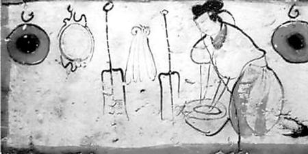 糧食、蔬菜品種與前代相比沒(méi)有大的變化,仍是漢地人的主要經(jīng)濟(jì)和衣食來(lái)源。烹飪方法,這一時(shí)期出現(xiàn)了面粉發(fā)酵技術(shù)。北魏賈思勰介紹發(fā)面技術(shù)說(shuō):“面一石,白米七八升作粥,以白酒六七升酵中,著火上,酒魚眼沸,絞去滓,以和面,面起可作”(《齊民要術(shù)》卷9)。把北魏時(shí)期的容量數(shù)換算成今天的市斤,上段話的意思就是,用五十多斤面粉,五六斤白米做粥,再用四五斤白酒(甜米酒)做酵母,將酒架火上燒至發(fā)出魚眼樣的小泡后,濾去酒渣,加入面粥中發(fā)酵,等面發(fā)起后就可以做餅了。這是一項(xiàng)歷史性的烹飪技術(shù)。從發(fā)面的數(shù)量看,一次發(fā)這樣多面的家庭,至少有三五十口人,顯然是當(dāng)時(shí)世家大族的人口規(guī)模。世族如此,普通民眾也應(yīng)很快就學(xué)習(xí)掌握了發(fā)面技術(shù)。
