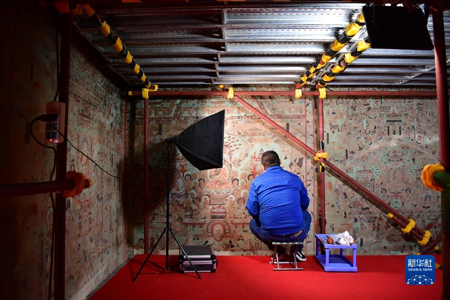 4月19日,在莫高窟第172窟,劉小同在對比臨摹壁畫的細節(jié)。新華社記者 杜哲宇 攝