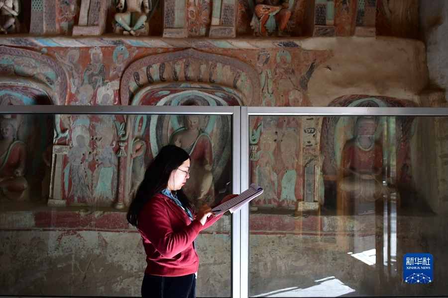 4月19日,王嬌在莫高窟第259窟做洞窟記錄。新華社記者 陳斌 攝