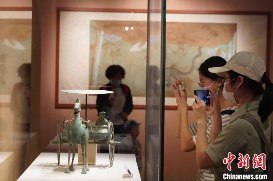 5月18日,游客來(lái)到位于蘭州的甘肅省博物館內(nèi)參觀《大道攸歸:五涼文化展》。圖為“銅獨(dú)角獸”?!【琶赖┰觥z