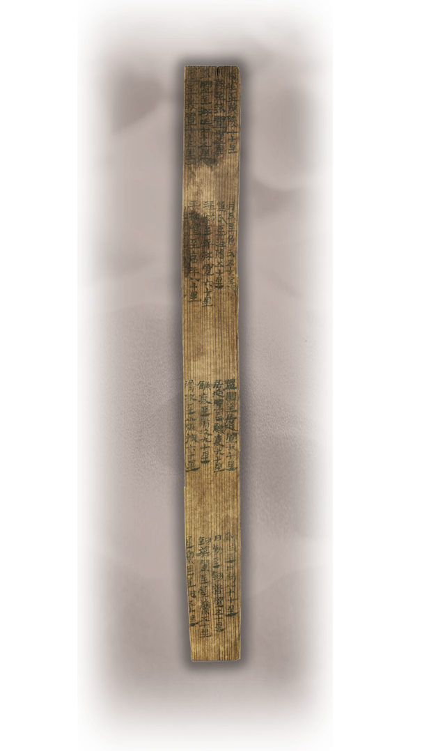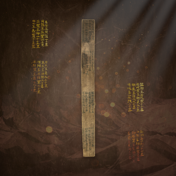 居延里程簡(jiǎn),漢代,國(guó)家一級(jí)文物,發(fā)現(xiàn)于1974年,出土于居延破城子遺址。簡(jiǎn)為松木制作,長(zhǎng)22.9厘米,寬2.1厘米,通簡(jiǎn)從上至下分四欄,每欄從右至左分四行(列)抄寫,計(jì)17行,地縣驛置名20個(gè)。