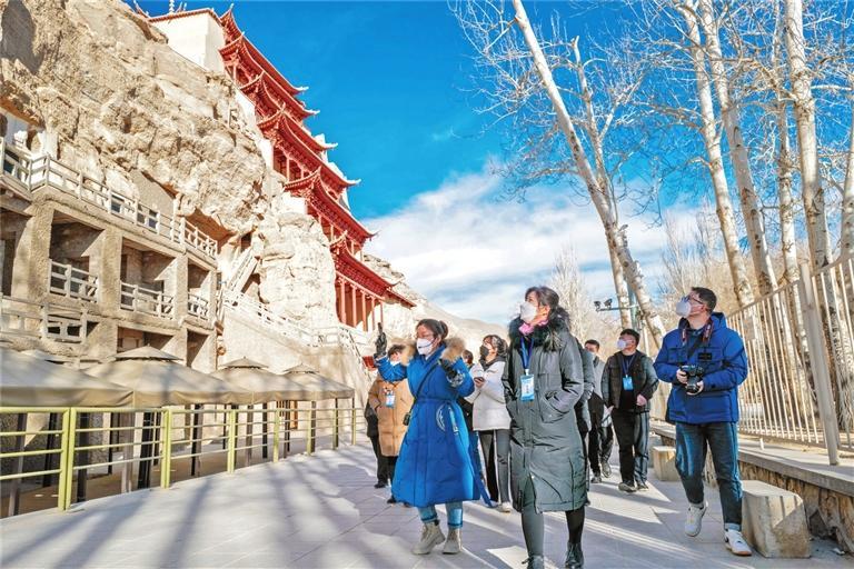 新年伊始,敦煌市舉行了“2022年-2023年冬春旅游優(yōu)惠政策發(fā)布暨敦煌文化研學(xué)季”活動啟動儀式,莫高窟推出門票半價、開放洞窟由8個增至12個并配資深講解員講解,多項優(yōu)惠措施吸引了眾多游客來敦煌觀光游覽。