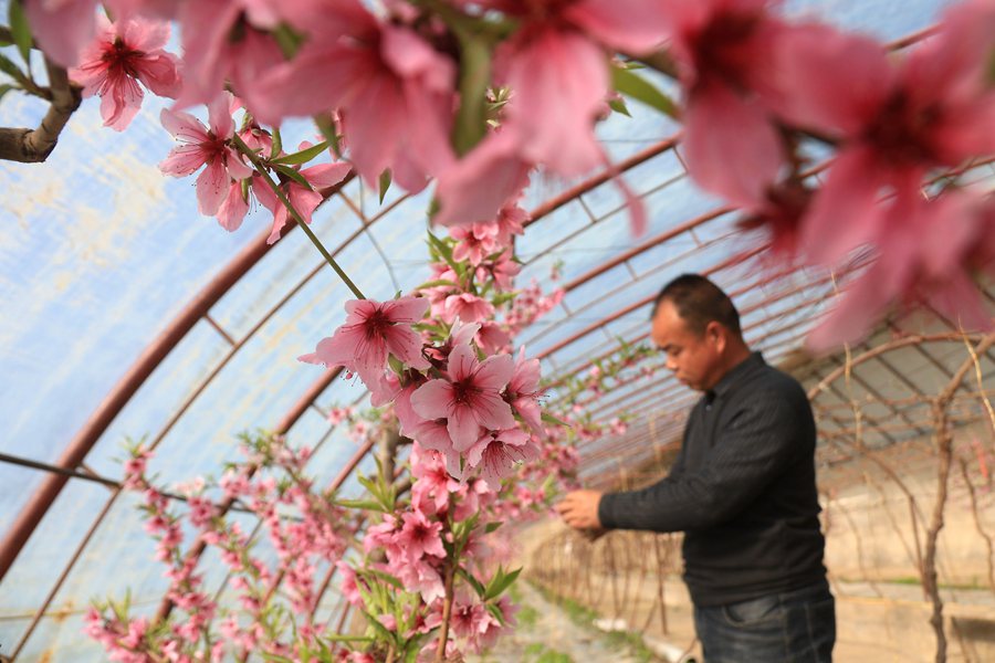 初春時(shí)節(jié),甘肅省敦煌市七里鎮(zhèn)戈壁設(shè)施農(nóng)業(yè)示范園區(qū)溫室中的桃花競(jìng)相綻放,濃濃春意撲面而來(lái),農(nóng)民忙著為桃樹(shù)壓枝、疏花,加強(qiáng)田間管理,為今年豐產(chǎn)豐收打牢基礎(chǔ)。