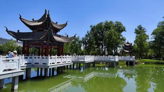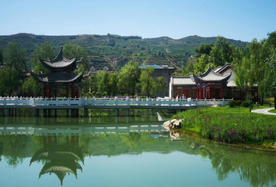 為景點命名。綜合考察廣河歷史文化遺存,細致視察公園營造之特色,遂將其命名為大夏公園,并結合園內景點布局、建筑特色、用途等,為亭、榭、湖、軒、橋等景點命名,如齊家亭、半山亭、天保廊、鐘鼎山房等。最讓人心曠神怡處,當為波光粼粼的湖面,因形狀頗似如意,故命名為如意湖,而分東西橫臥在湖面最狹窄處的兩座握橋,分別命名金龍橋、玉鳳橋。