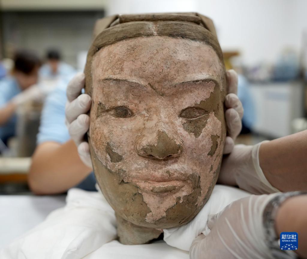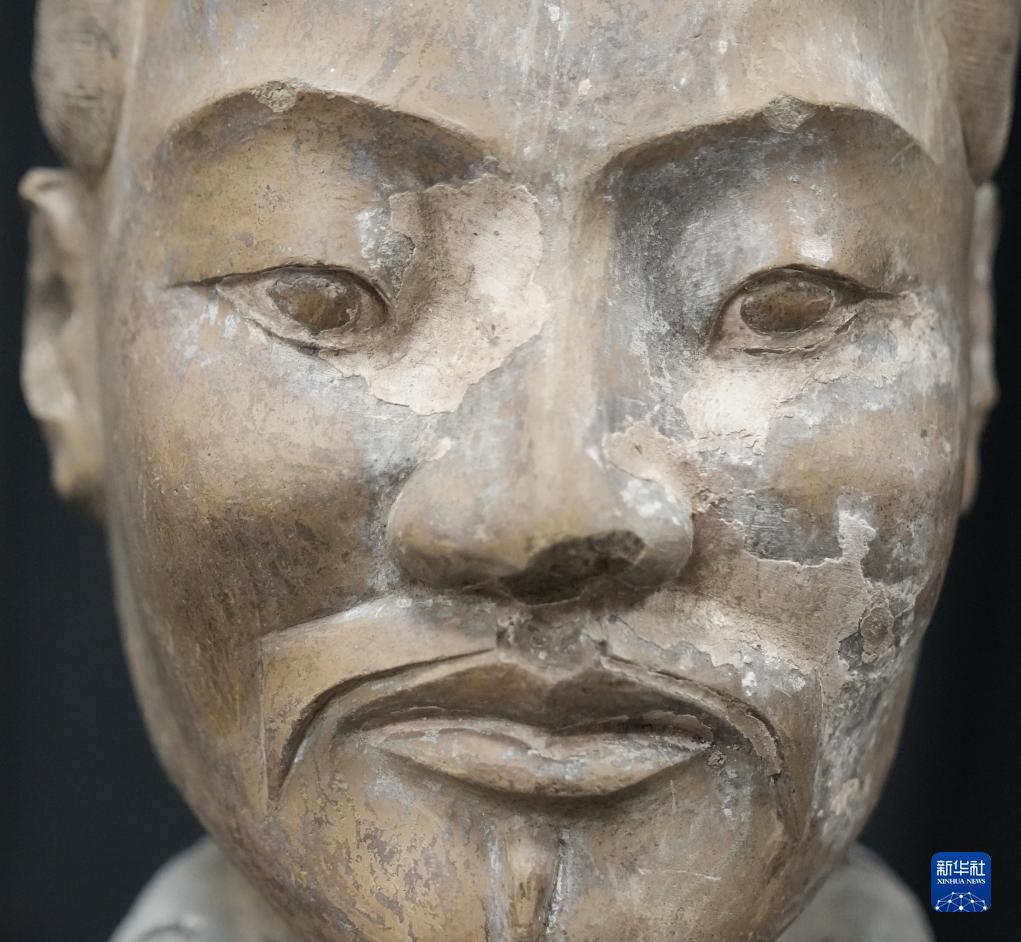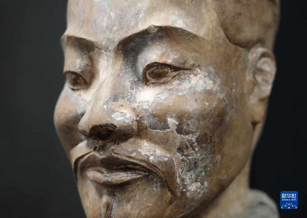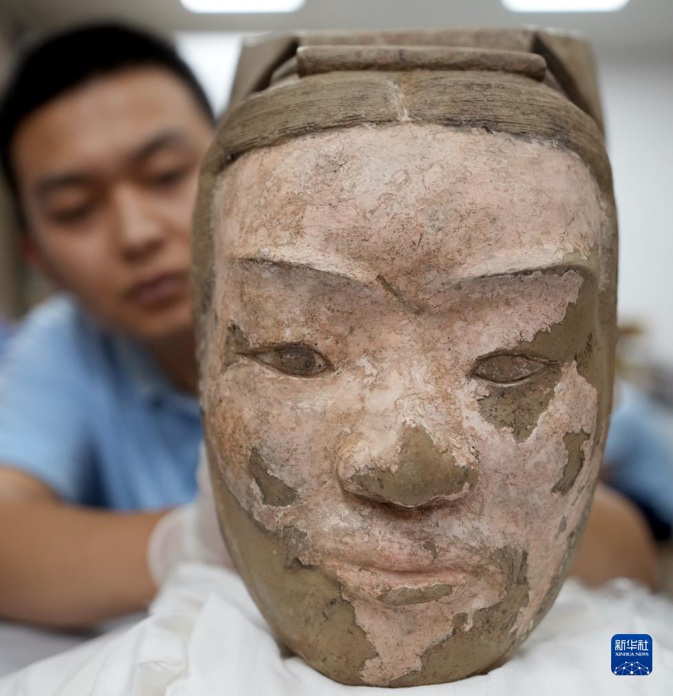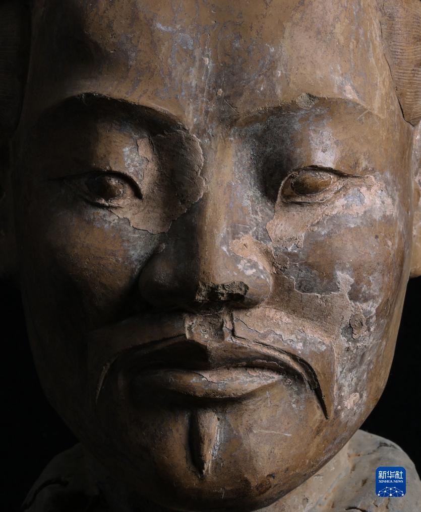 在秦始皇帝陵博物院文物保護部彩色陶俑修復室內,一尊秦俑臉部尚存部分彩繪層。秦俑五官的精準塑造顯示出秦代匠人具有高超的寫實能力(8月23日攝)。