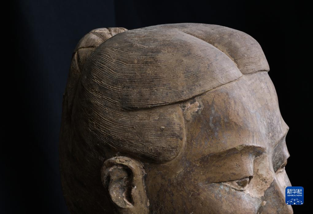 在秦始皇帝陵博物院文物保護部彩色陶俑修復室內,一尊秦俑的頭發(fā)分毫畢現(xiàn)( 8月23日攝)。