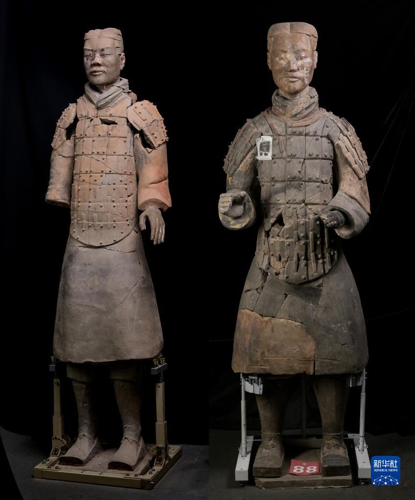 兩尊經過修復的彩色秦俑佇立在秦始皇帝陵博物院文物保護部彩色陶俑修復室內(拼版照片,8月23日攝)。