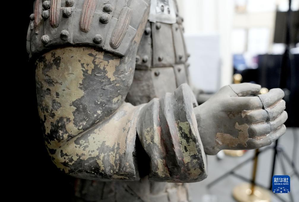 在秦始皇帝陵博物院文物保護部彩色陶俑修復室內,一尊秦俑的手部特寫顯示出豐富的細節(jié)(8月23日攝)。