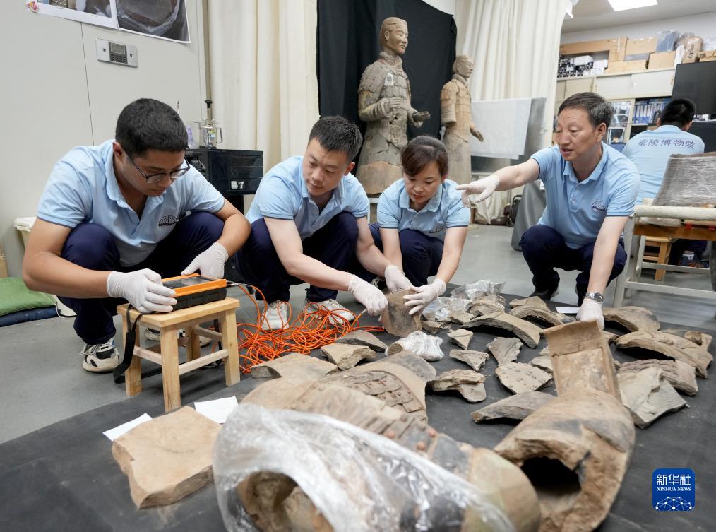 技術人員在拼接秦俑軀干殘片(8月23日攝)。