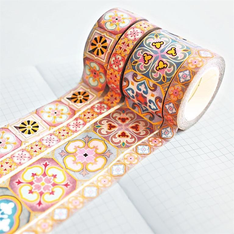 紋樣膠帶——在眾多文創(chuàng)產(chǎn)品中,膠帶的銷售或人氣排行榜靠前。紙膠帶雖是個(gè)小物件,但藝術(shù)化的紙膠帶卻能夠滿足多種需求,適應(yīng)多層次人群的需求。圖形多來(lái)自器物上的印刻、繪制圖案,或抽象或具體。這也就體現(xiàn)了兩種效果,一種是文藝范,另一種是趣味感,來(lái)自重構(gòu)傳統(tǒng)的高大上,消解歷史的審美觀。設(shè)計(jì)靈感來(lái)自中國(guó)傳統(tǒng)紋樣,融合敦煌元素,有層次的色彩斑斕,圖案以及細(xì)節(jié)都恰到好處。