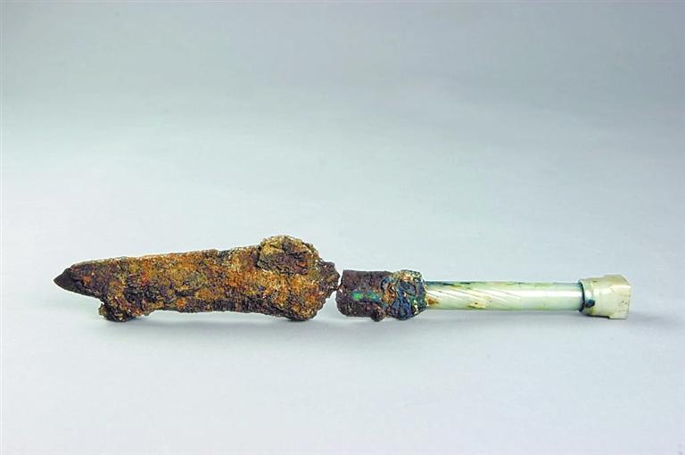 玉柄鐵劍出土于河南三門(mén)峽虢國(guó)國(guó)君虢季的墓葬,全長(zhǎng)34.2厘米,其中劍柄長(zhǎng)12.2厘米,劍身長(zhǎng)22厘米。劍柄為銅芯,起到連接劍柄和劍身的作用,銅芯外鑲有晶瑩透亮的和田美玉和綠松石,并有精美的竹節(jié)飾紋,劍身和劍柄的結(jié)合處也鑲有綠松石。劍身經(jīng)由北京科技大學(xué)冶金與材料史研究所鑒定,是由塊煉法鍛制而成,劍身外有絲織品包裹的痕跡,應(yīng)當(dāng)是被絲織品包裹后放入劍鞘。劍鞘則由牛皮精制而成。這把玉柄鐵劍不僅制作精美,而且其利用玉、銅、鐵三種材料制作而成,是我國(guó)目前考古發(fā)掘出土的年代最早的人工冶鐵制品。它將我國(guó)的人工冶鐵歷史推前了近兩個(gè)世紀(jì),被專家們譽(yù)為“中華第一劍”。