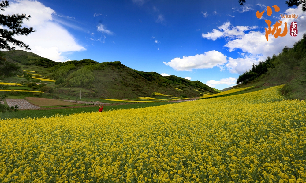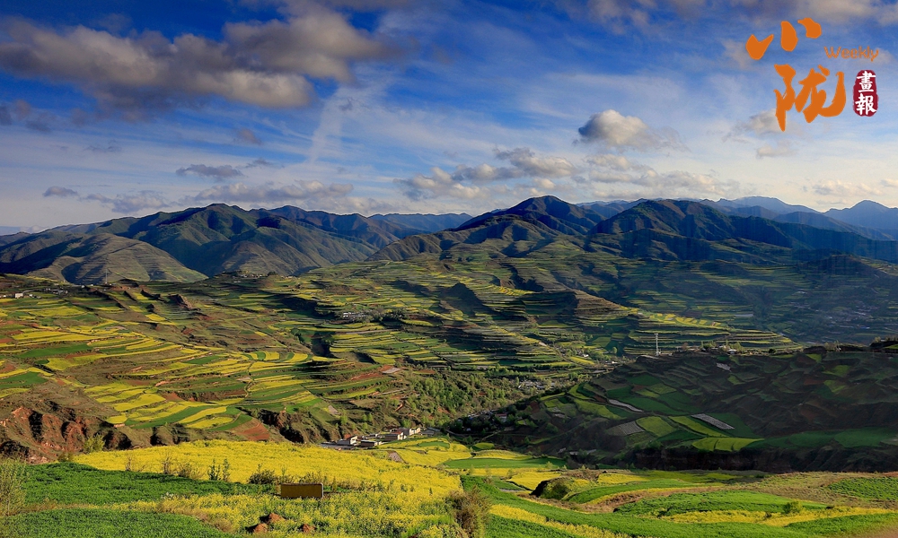 遠(yuǎn)處黃綠交錯(cuò)的油菜花,在藍(lán)天白云襯托下艷麗多彩,起伏的山巒上黃色顯得尤為斑斕,這里是眾多畫家、藝術(shù)家的創(chuàng)作天堂。