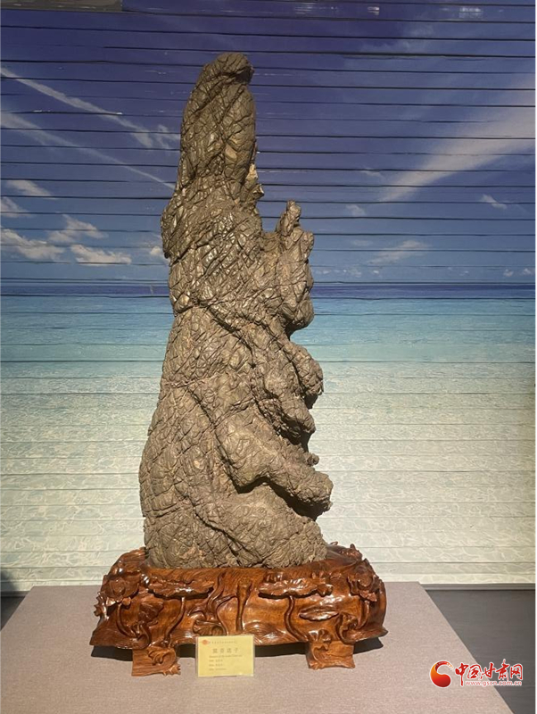臨洮洮河石文化博物館突出的特點是“奇”“妙”,有的石頭形狀或花紋的確奇特精美,也有很多石頭的造型和花紋則是通過巧妙的解讀而妙趣橫生。觀賞著這些奇石,再看它們的命名標簽,仔細琢磨,拍案叫絕。“菊”確實是黑色的石頭上布滿了狀如菊花的白色石花,還有一些作品,若不是看到“慈航普渡”“朝圣”“觀音送子”“二仙相會”等標簽,我是很難想到這些主題,而再仔細咂摸品味,確實是那么回事,自己的思維完全折服于創(chuàng)造者的牽引。這些石頭本是天地造化使然,而賞石、藏石家們的解讀,仿佛又一次為它們注入了魂魄。