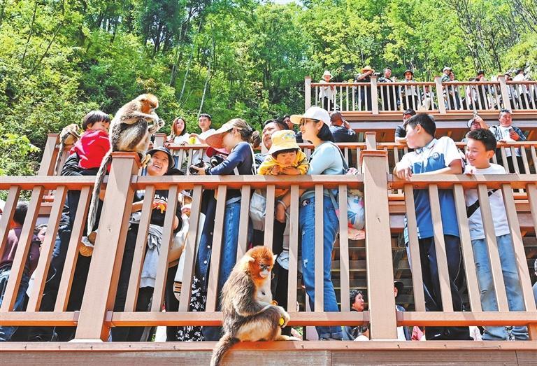游客在隴南市武都區(qū)裕河鎮(zhèn)與川金絲猴親密接觸。新甘肅·甘肅日?qǐng)?bào)記者 丁凱