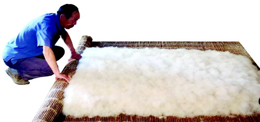 他一邊介紹一邊演示,先用白土揉進(jìn)羊毛,吸掉油氣,再用彈弓加工松軟,并用手拍打鋪放均勻。搟氈前,還要撒面粉,通常中等大小的毛氈摻兩斤多面粉,以增加黏性和柔性。之后還要淋上開水,高溫瞬間會使羊毛變軟。