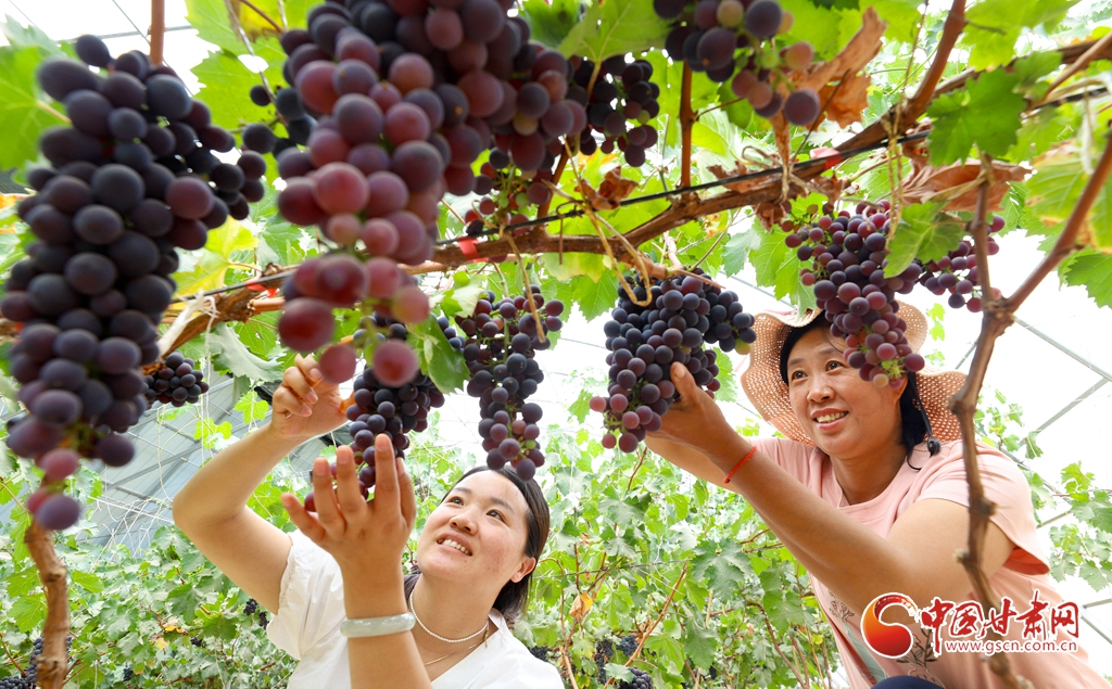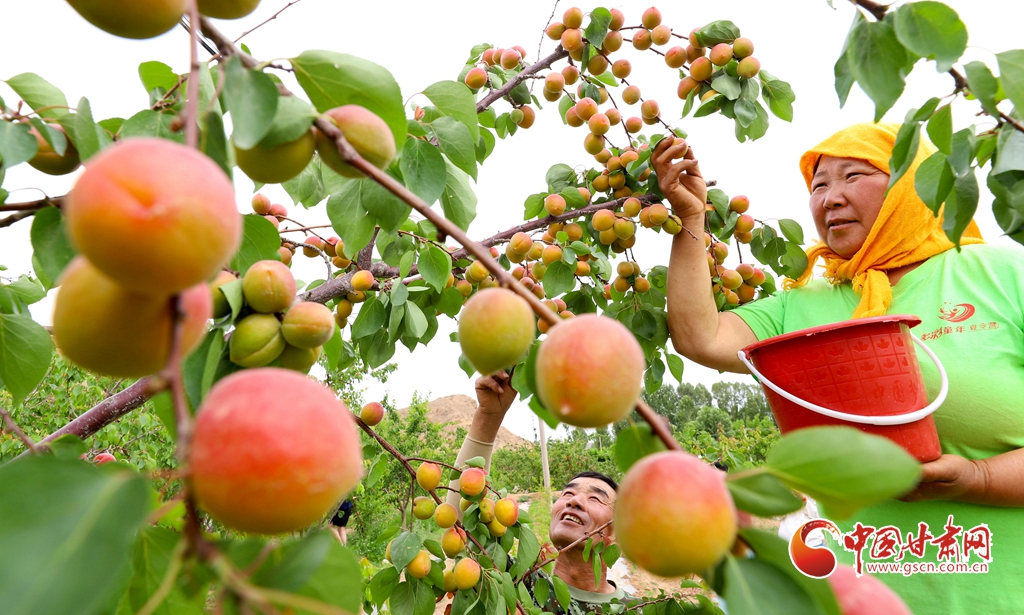 6月5日,在張掖市臨澤縣板橋鎮(zhèn),果農(nóng)們正在采摘成熟的杏子、桑葚、葡萄。