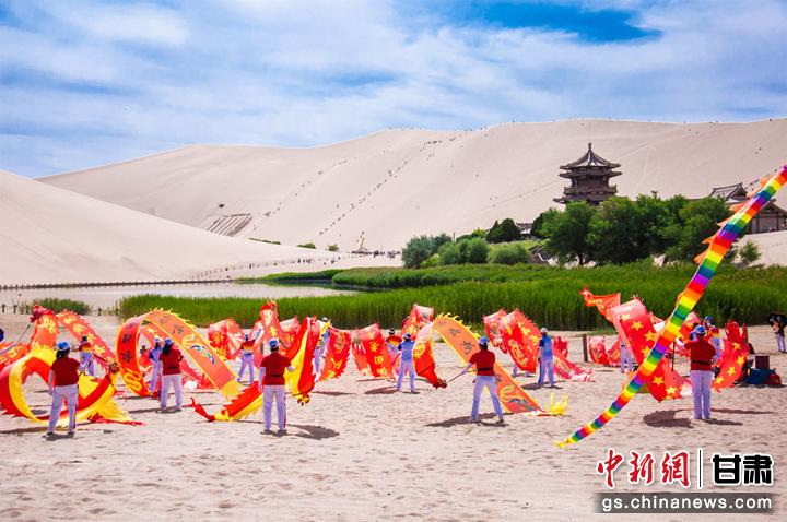 6月10日,敦煌市鳴沙山下,一場以敦煌市舞龍隊(duì)為首的20個健身舞蹈隊(duì)為廣大市民和游客獻(xiàn)上一臺臺精彩的舞蹈盛宴,吸引了眾多游客圍觀、拍照,在敦煌大漠度過一個難忘的端午節(jié)。王斌銀 攝