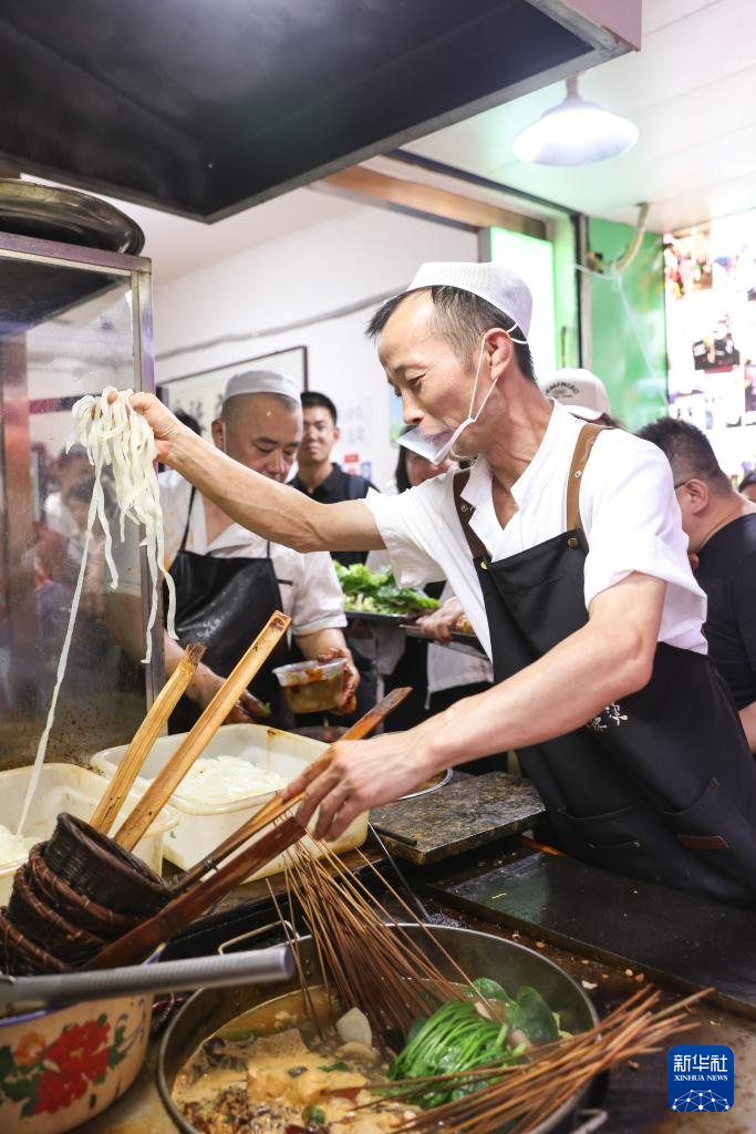 7月22日,在天水市秦州區(qū)天水古城內(nèi)的一家麻辣燙店,店員制作天水麻辣燙。新華社記者 范培珅 攝