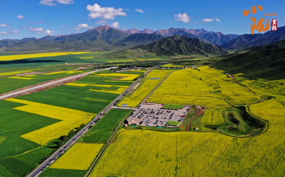 在藍(lán)天白云和祁連雪峰的映襯下,那盛開的油菜花、點(diǎn)綴在花海中的村莊人家,勾勒出一幅優(yōu)美的田園風(fēng)光畫卷。