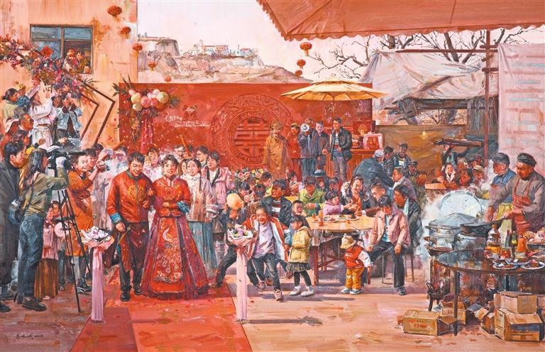 《成紀(jì)二月喜盈門(mén)》描繪了秦安一對(duì)新人舉辦婚禮的場(chǎng)景。身著傳統(tǒng)服飾的新人,在親朋好友祝福中朝觀眾走來(lái)。靜心觀察,會(huì)發(fā)現(xiàn)每個(gè)人都充滿鮮明的角色感,樸拙的外表、內(nèi)蘊(yùn)的情感、濃厚的民俗、歡樂(lè)的場(chǎng)景,共同交織成一方地域上的斑斕畫(huà)卷。