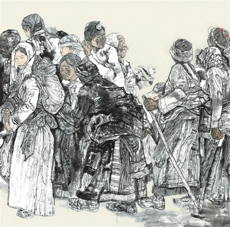 作品《趕集》主要描繪了不同年齡階段的人物聚集一起趕集的一幕,以筆墨求真的態(tài)度,通過(guò)不同的形象去表現(xiàn)人物的真善美。在落墨前,我對(duì)人物造型和畫面形式結(jié)構(gòu)反復(fù)推敲打磨,力求作品更有溫度和厚度。