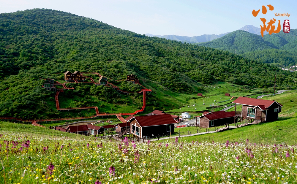 放眼望去,山峰起起伏伏,宛如鋪上了一層綠毯。山巒與草坡、森林及紅瓦白墻映入眼簾,景區(qū)道路伸向遠方。