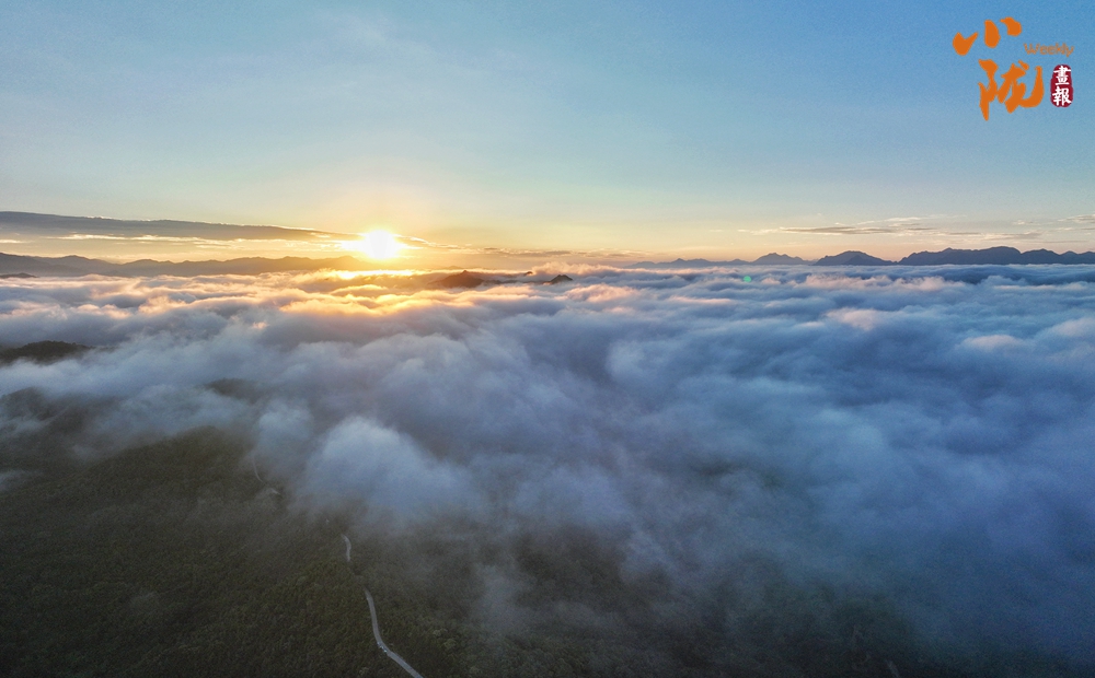 重山峻嶺間,白云如棉花般柔軟,遠處的群峰在朝陽映照和云霧的烘托下,勾勒出一幅綠色畫卷。