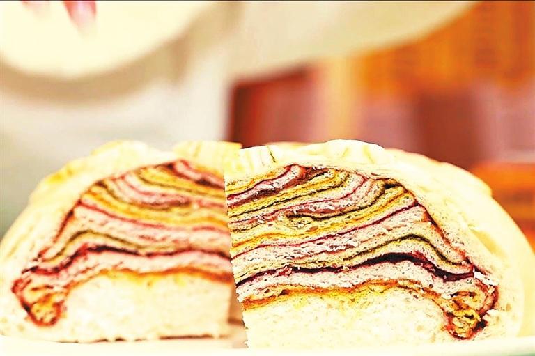 母親最拿手的還是做千層大月餅,做法與平常做饃有點(diǎn)不一樣,發(fā)好面后取適量揉好,切成同樣大小的若干份并搟壓成長(zhǎng)方形的薄面皮。一層薄皮一層餡,餡料與烙的糖饃有的不一樣,重在色澤,每層分別抹上姜黃、紅曲、苦豆(香豆)粉、芝麻、菜籽油、糖玫瑰、葡萄干,黃、紅、黑、綠相間,一層黃一層綠一層紅一層黑,一層白糖一層紅糖一層玫瑰糖,一層一層摞好,做成一個(gè)六七層的圓餅。最后用薄皮蓋住一摞摞面皮,餅邊捏緊捏好后壓花塑形,表面用模型壓花,用專(zhuān)用做飯梳子一行行點(diǎn)上,或一行白鷺上青天,面皮如一塊畫(huà)布,精雕細(xì)琢,怎么好看怎么做,做得隨心所欲又精心設(shè)計(jì)。還會(huì)刷姜黃與菜籽油拌好的油料,撒上芝麻粒和葡萄干,一個(gè)千層餅就基本成型了。