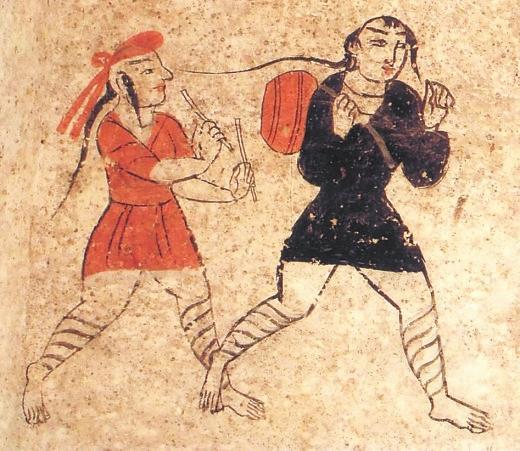 除此之外,河西彩繪壁畫磚圖像中,還有一些反映娛樂的圖像,主要有樂舞圖和六博圖。高臺(tái)地埂坡壁畫中的“角抵百戲”中,一著辮者在作表演,他小腿部網(wǎng)狀綁腿,蹲踞,雙手?jǐn)傞_,似乎是在表演魔術(shù),又似乎是在歡迎到場(chǎng)的人們。“擊鼓”中,兩人網(wǎng)狀繃腿,髡發(fā)梳辮,著黑裝者背鼓,著紅裝者持雙鼓槌準(zhǔn)備擊鼓。孫機(jī)先生謂,戰(zhàn)國(guó)迄漢盛行六博,博具和博戲的圖像在考古資料中不乏其例。甘肅以武威磨嘴子漢墓出土木六博俑為例。六博俑以簡(jiǎn)單明確的藝術(shù)造型,刻畫了兩個(gè)老者全神貫注博弈的場(chǎng)面,惟妙惟肖地表現(xiàn)出對(duì)弈時(shí)蓄勢(shì)待發(fā)的場(chǎng)面。在高臺(tái)壁畫墓中的博戲場(chǎng)面略有不同,二博者戴船形帽,打手勢(shì)。從相貌看,很可能是少數(shù)民族。高臺(tái)出土彩繪壁畫磚上,兩人動(dòng)作幅度更大,左邊一人的黃紅色著裝和博具上的零散物品,顯得場(chǎng)面更為熱烈激情。