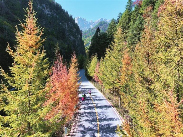金秋時(shí)節(jié),位于宕昌縣的官鵝溝國(guó)家森林公園秋色盡染,斑斕如畫(huà)。