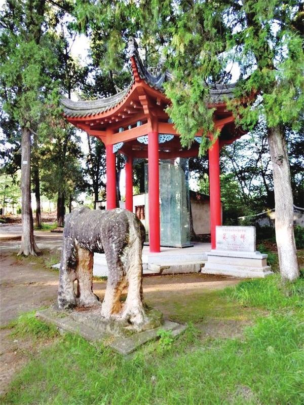 到達山頂?shù)膮谦d墓,眼前出現(xiàn)的是兩尊相向而立高大的宋代石人,石人的不遠(yuǎn)處是一對相互對望的石馬。在這兩匹宋代高大石馬的后面,是一個由六根朱紅色木柱擎起的六角亭。亭子里一塊石碑矗立其間,碑上刻著 “宋故開府吳公墓志銘”。