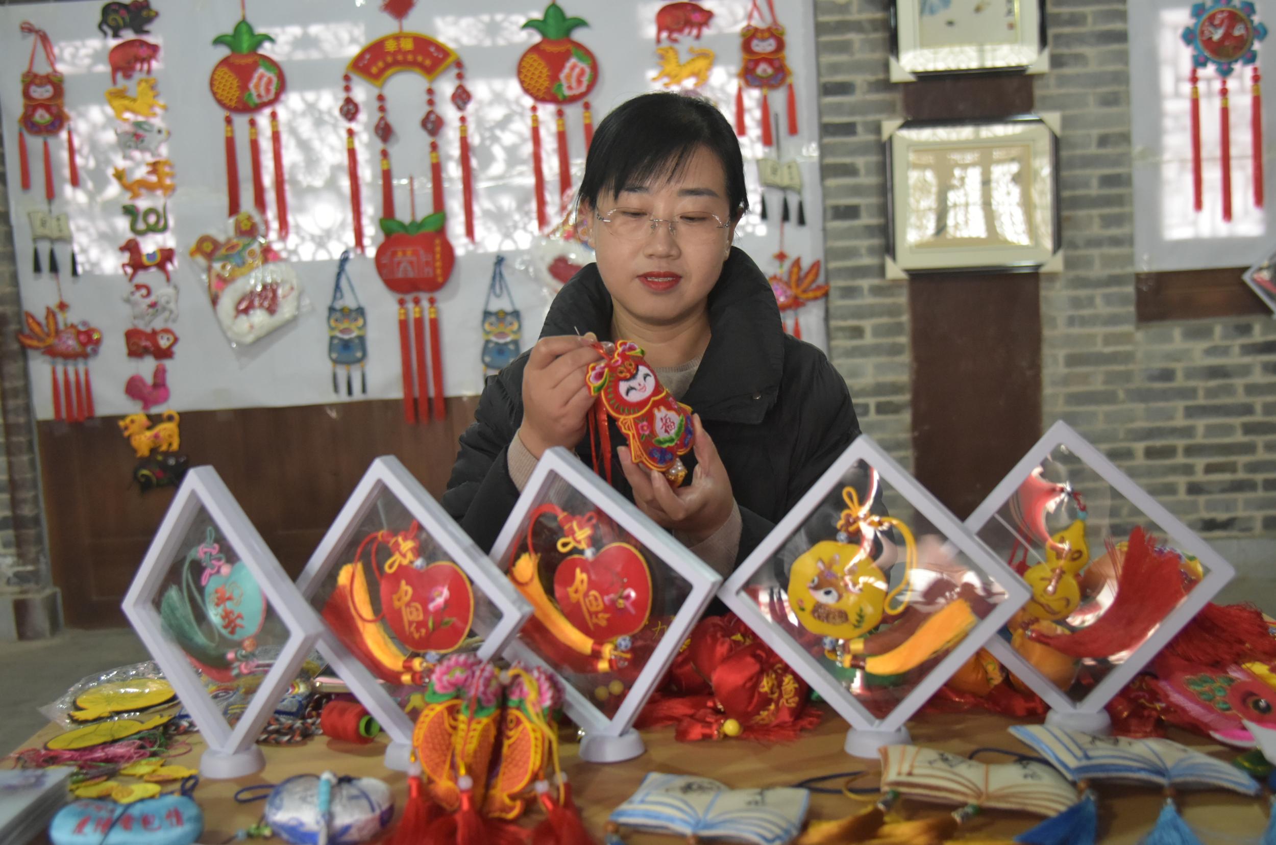 除了剪紙,鎮(zhèn)原縣香包、刺繡、書法等傳統(tǒng)文化藝術(shù)氛圍也很濃厚,深受廣大群眾喜愛。在文化一條街,十幾家書畫、香包、刺繡工作室緊挨,組成了一條文化長(zhǎng)廊,除了銷售文創(chuàng)產(chǎn)品外,還承擔(dān)著非遺文化傳承和技藝培訓(xùn),熱鬧而又成氣候。“作為一名非遺傳承人,不僅要把自己的香包刺繡產(chǎn)品設(shè)計(jì)好、做精致,更重要的是要把這門技藝教給更多的人,讓香包、刺繡這門技藝更好地傳承下去。”慶陽香包刺繡非物質(zhì)文化遺產(chǎn)傳承人任艷艷說,自己在文化一條街已經(jīng)開店近十年了,帶出了很多巧媳婦巧婆婆,還不時(shí)受邀在縣內(nèi)外進(jìn)行培訓(xùn)指導(dǎo)。