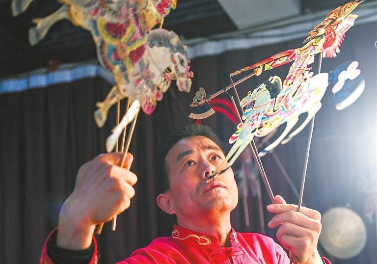 近日,記者走進(jìn)環(huán)縣環(huán)州故城道情皮影館,燈光暗去,音樂響起,泛黃的幕布后,市級非遺代表性傳承人許明堂的“老道情”吼起來,在他的十指轉(zhuǎn)動間,幕布上的皮影人物“活”起來:坐臥、行走、提袍甩袖,伴隨著各種樂器,一場精彩的《羅通掃北》皮影戲上演。