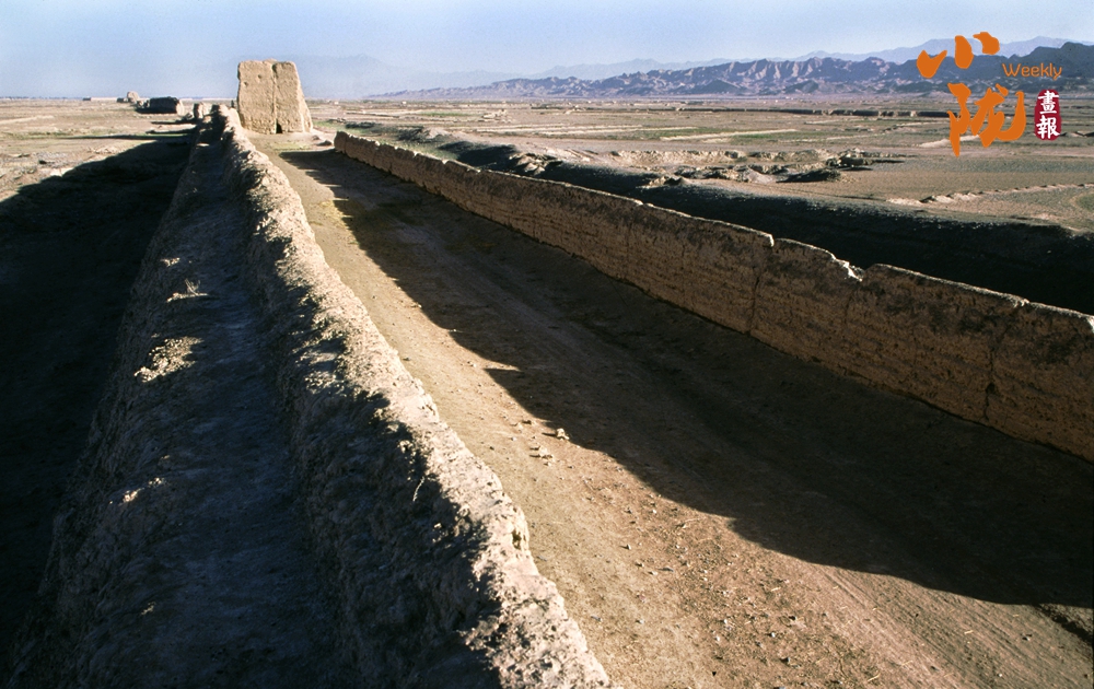 在黛藍(lán)色山脈的映襯下,漢明長城蜿蜒并行,高于地面的黃色城墻是明長城,而顏色稍深的壕溝是漢長城,兩條跨越千載的古長城最近處不過十余米,仿佛攜手講述著遠(yuǎn)古的故事……它們也猶如兩位忠誠的衛(wèi)士,守護著這片古老的土地,也見證了絲綢之路的興衰變遷。