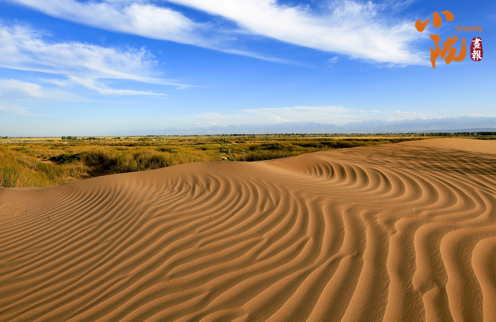 站在綠洲與大漠的結合處,觀賞四方風景,眼前奇異的景致讓人驚嘆萬分:一邊是莽莽蒼蒼、雄渾博大、無邊無際的大漠海洋,一邊是郁郁蔥蔥、娟秀嫵媚的綠洲碧野。這是大自然杰出的造化,這黃色與綠色之間沒有任何過渡,兩色卻形成鮮明的對比,宛如畫家手下的色盤,黃綠分明、對比強烈而又和諧統一,令人叫絕?!?/p>