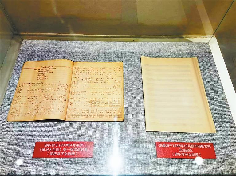 記者在《黃河大合唱》展覽館看到,展出的鄔析零1939年4月手抄《黃河大合唱》第一版簡(jiǎn)譜總譜,字跡小而工整,旁邊還陳展著幾頁(yè)五線譜紙,那是冼星海從巴黎帶回來(lái),自己舍不得用,送給鄔析零的,而鄔析零也沒(méi)舍得用,就留存到了現(xiàn)在。這,都是歷史的見證。