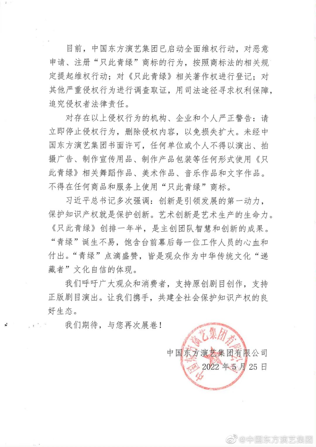 此次在聲明中,中國東方演藝集團呼吁廣大觀眾和消費者,支持原創(chuàng)劇目創(chuàng)作,支持正版劇目演出,攜手共建全社會保護知識產(chǎn)權(quán)的良好生態(tài)。