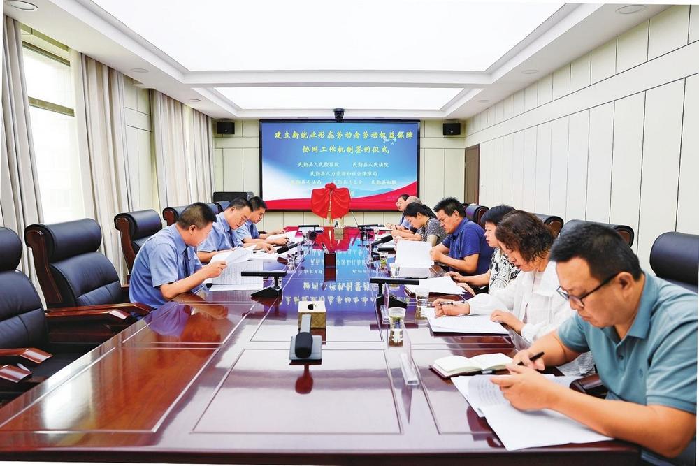 民勤縣檢察院邀請法院、人社、司法、工會、婦聯(lián)等部門單位召開座談會,共同簽訂《關(guān)于建立新就業(yè)形態(tài)勞動者勞動權(quán)益保障協(xié)同工作機(jī)制的意見》(2024年6月7日拍攝)。